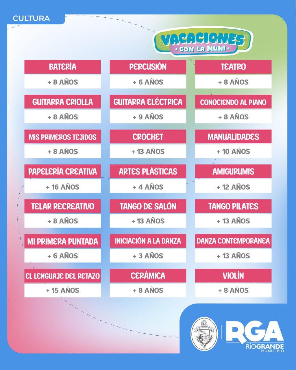 El Municipio de Río Grande pondrá en marcha una nueva edición de “Vacaciones con la Muni”, una propuesta cultural pensada para acompañar a vecinos y vecinas durante el receso estival con actividades gratuitas y abiertas a todas las edades. En ese marco, el lunes 29 de diciembre se habilitarán las inscripciones para los talleres de verano del Centro Cultural Alem.