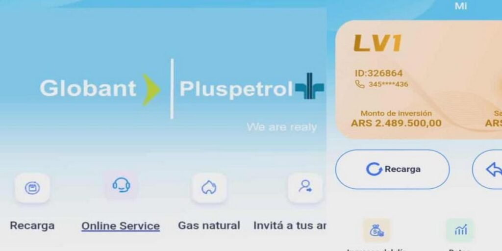 Los estafadores utilizaban una aplicación que mostraba supuestas inversiones en crecimiento, ofreciendo retornos de hasta un 50% en apenas cinco días. Todo se reforzaba con la imagen de empresas reconocidas —como Globant y Pluspetrol— que nunca tuvieron relación con esta organización criminal.