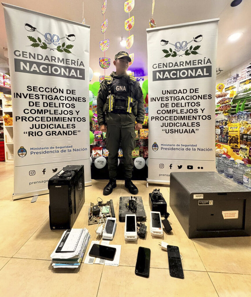 Además, se incautaron 7.600 atados de cigarrillos, 502 gramos de marihuana, dos cajas fuertes, un fusil Máuser, una carabina, 85 municiones calibre 9 milímetros, un vehículo Renault Kangoo, 15 teléfonos celulares, 13 terminales de cobro electrónico (posnet), 7 DVR, 16 computadoras portátiles, 20 dispositivos de almacenamiento y documentación relevante para la causa.