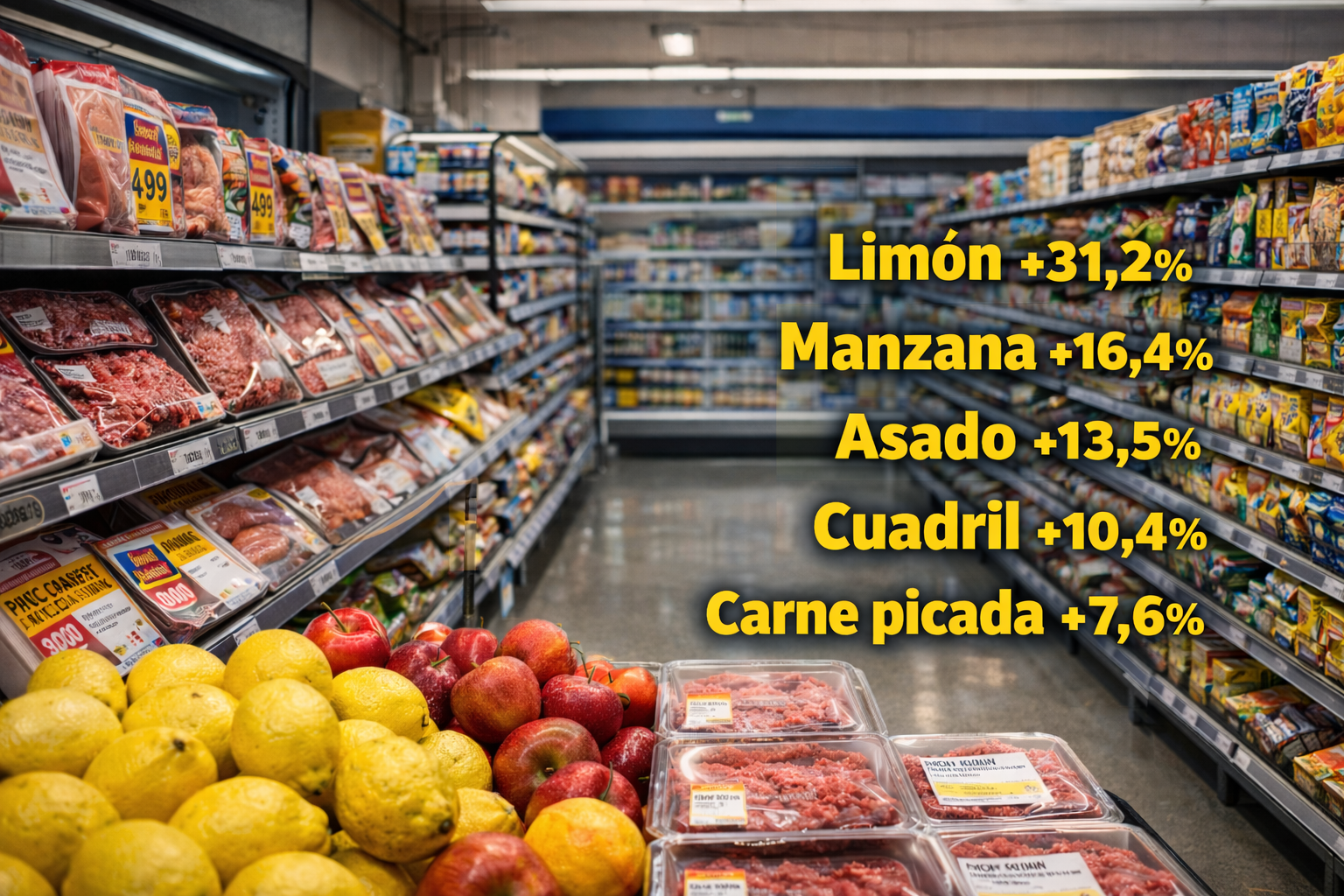 Al analizar el comportamiento de los precios a nivel de productos, el relevamiento del INDEC para el Gran Buenos Aires mostró fuertes incrementos concentrados principalmente en frutas y cortes de carne. El limón encabezó las subas con un aumento del 31,2%, seguido por la manzana deliciosa (+16,4%) y el asado (+13,5%). También registraron alzas significativas el cuadril (+10,4%), la nalga (+9,9%), la naranja (+9,7%) y el zapallo anco (+9,4%). A estos se sumaron incrementos en la carne picada común (+7,6%), el pan de mesa (+6,3%) y las hamburguesas congeladas (+4,6%).