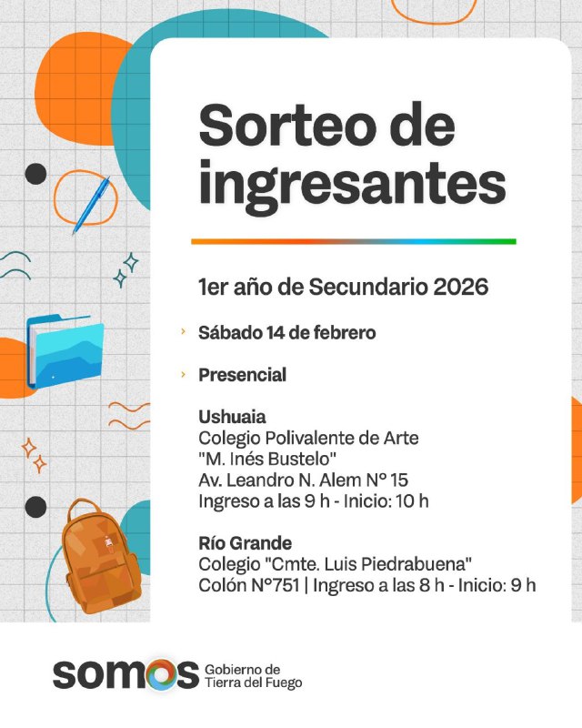 En la ciudad de Ushuaia, los establecimientos con vacantes son los colegios Los Andes, José María Sobral, Ernesto Sábato, Eva Duarte de Perón, Kloketen y el Polivalente de Arte “M. Inés Bustelo”. El sorteo se llevará a cabo en este último establecimiento, ubicado en Avenida Leandro N. Alem N° 15. Las puertas se abrirán a las 9:00 horas y se cerrarán a las 10:00, momento en el que dará inicio el sorteo.