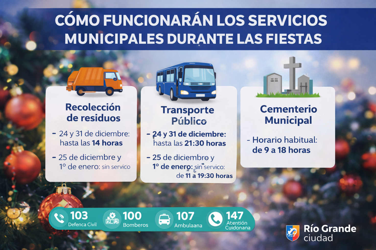 El Municipio de Río Grande dio a conocer el esquema especial de funcionamiento de los servicios municipales durante las celebraciones de Navidad y Año Nuevo, con el objetivo de que vecinos y vecinas puedan organizarse con anticipación.