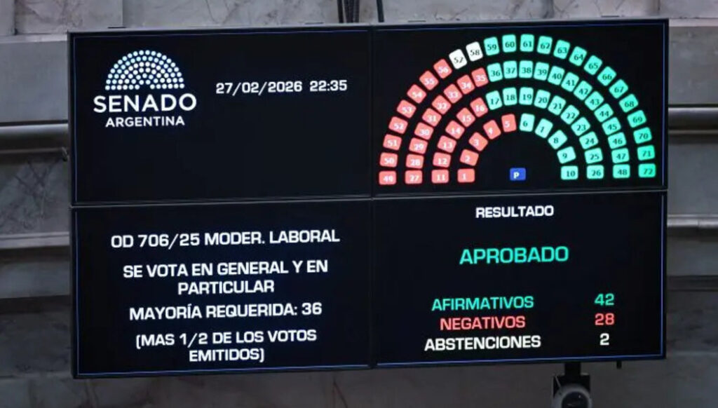 La Cámara alta aprobó el proyecto de “Modernización Laboral” con 42 votos a favor, 28 en contra y 2 abstenciones, tras eliminar un artículo polémico. La norma introduce cambios en varios aspectos del derecho laboral argentino.