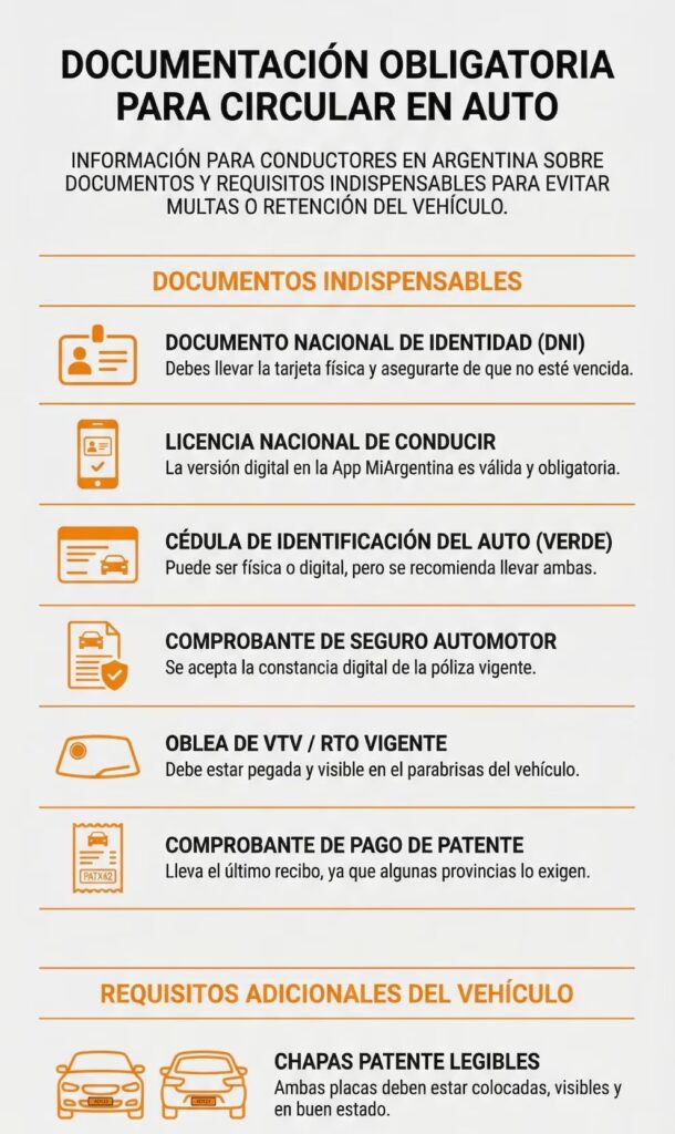 Con el volumen de autos viajando por las rutas argentinas en esta segunda quincena de diciembre por vacaciones y fiestas, los controles de documentación y técnicos están más firmes que nunca. No mostrar los documentos exigidos puede resultar en multas o incluso impedir que sigas tu viaje. La normativa vigente sigue siendo la misma que establece la Ley Nacional de Tránsito 24.449, aunque cada provincia puede sumar requisitos propios.