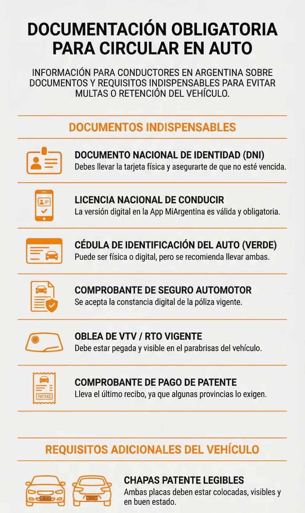 La licencia habilitante tiene validez digital (por ejemplo en la app Mi Argentina) con un código QR que se actualiza cada 24 horas. Debe corresponder a la categoría del vehículo y estar emitida en la jurisdicción de tu domicilio. - Cédula de identificación del automotor