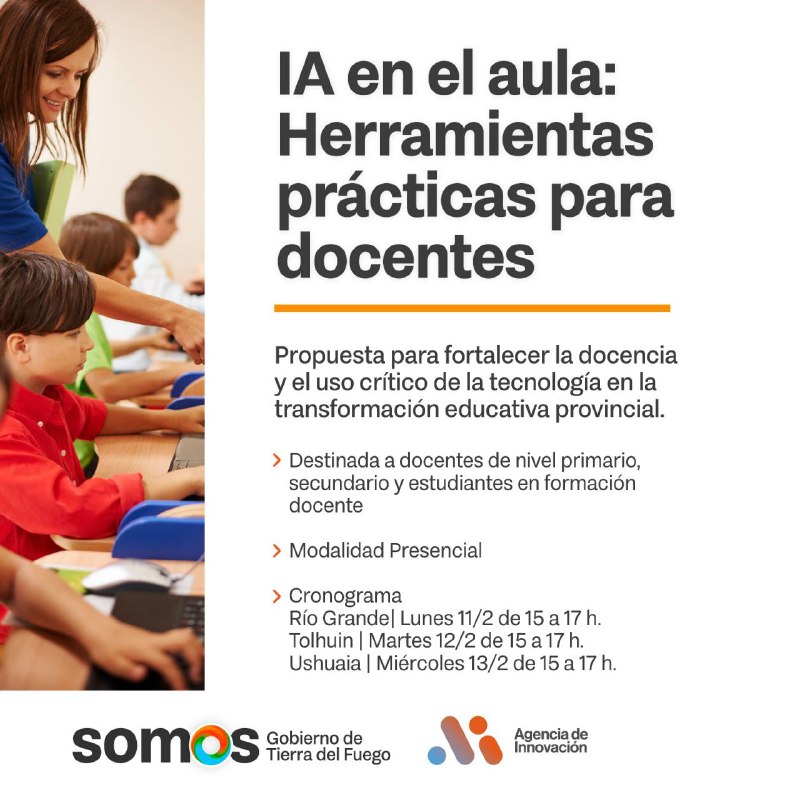 El Gobierno de la Provincia, a través de los Polos Creativos, llevará adelante el Taller de Introducción y Aplicación de la Inteligencia Artificial para Docentes, una propuesta de capacitación presencial destinada a docentes de Nivel Primario y Secundario, así como a estudiantes en formación docente de toda Tierra del Fuego.