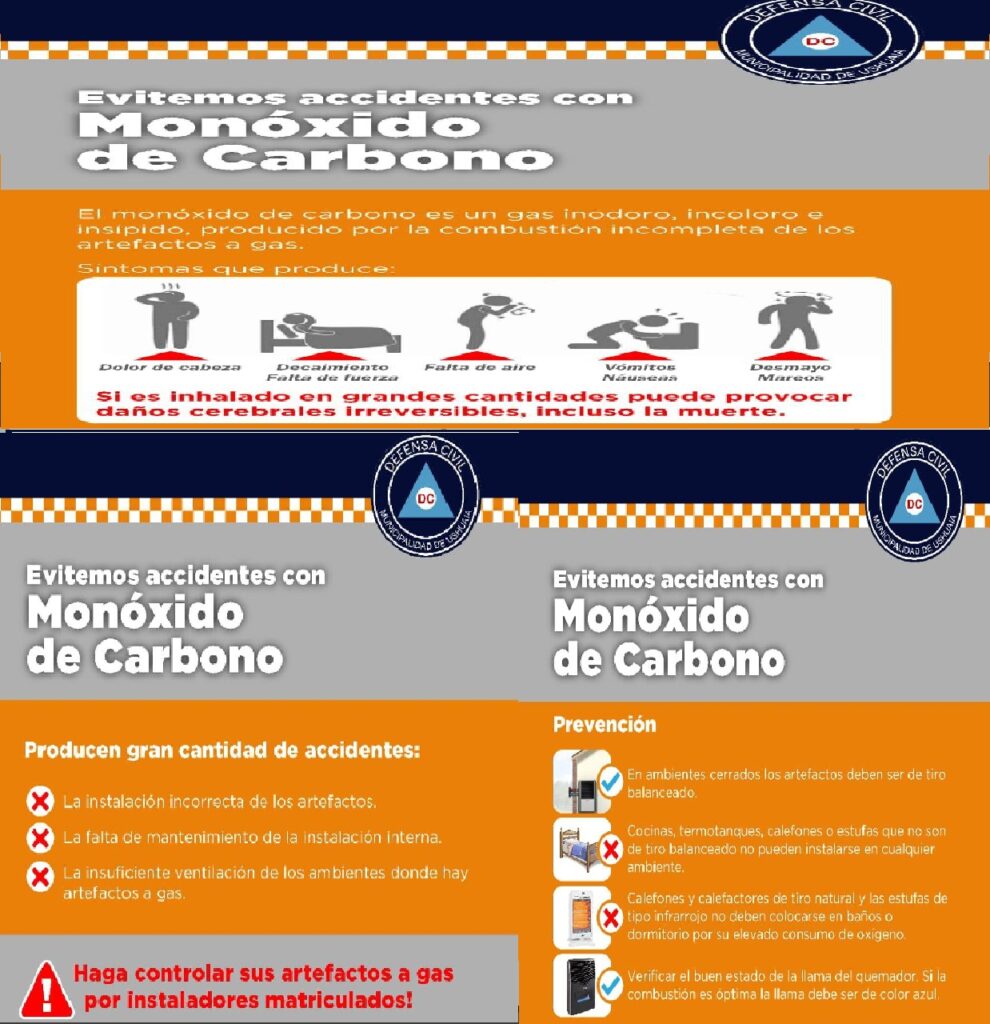 En caso de presentar síntomas compatibles con intoxicación, como dolor de cabeza, debilidad, náuseas, mareos o pérdida de conciencia, se recomienda evacuar el ambiente inmediatamente y comunicarse con Defensa Civil al 103 o al número de emergencias 911.