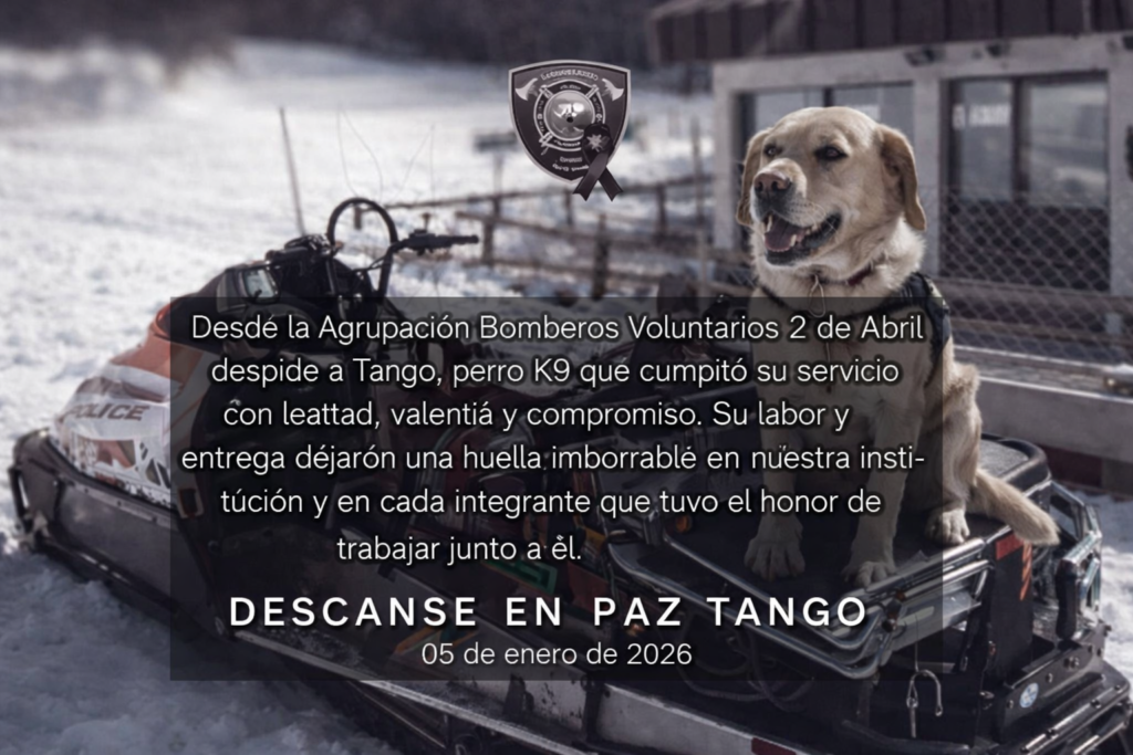 Ushuaia, lunes 5 de enero — La comunidad bomberil atraviesa una jornada de profundo pesar tras la despedida de Tango, el perro K9 que formó parte de la Agrupación Bomberos Voluntarios 2 de Abril y que cumplió su servicio con lealtad, valentía y un compromiso ejemplar.