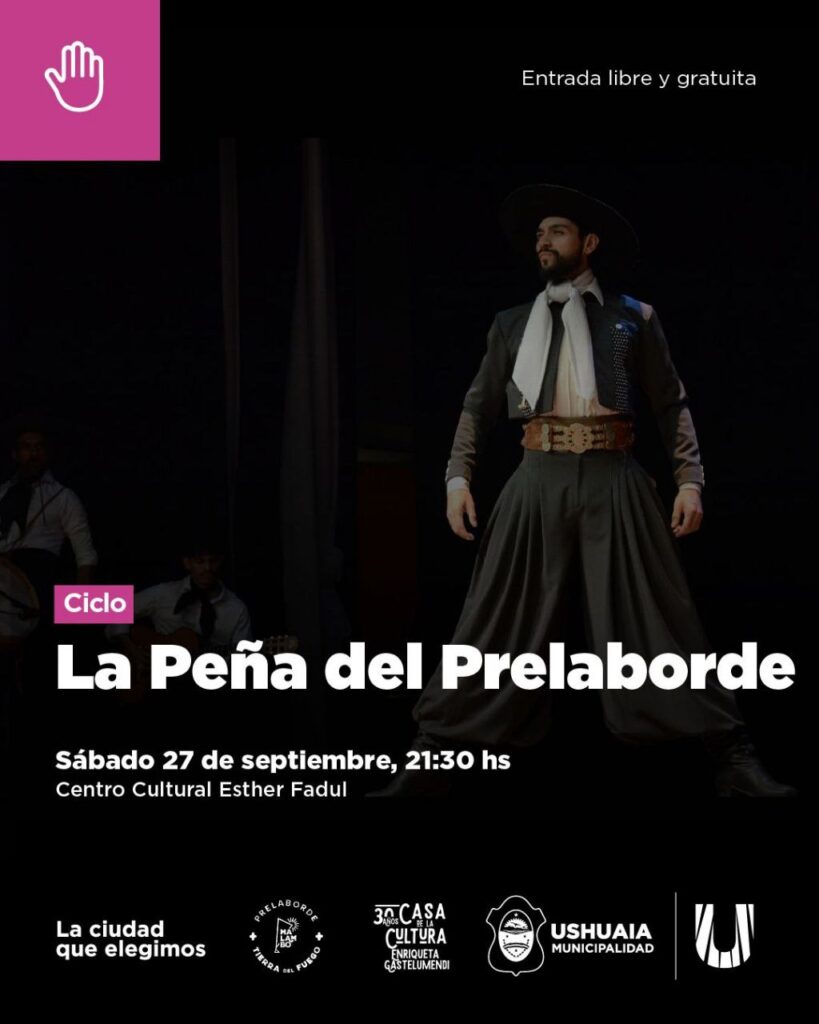 La Municipalidad de Ushuaia, a través de la Secretaría de Cultura y Educación, acompañará este sábado 27 de septiembre la “Peña del Prelaborde” en el Centro Cultural Esther Fadul. La cita será a partir de las 21:30 horas, luego de la finalización del Preselectivo que definirá a las y los representantes de Tierra del Fuego para el Festival Nacional del Malambo, que tendrá lugar en enero de 2026 en Laborde, Córdoba.