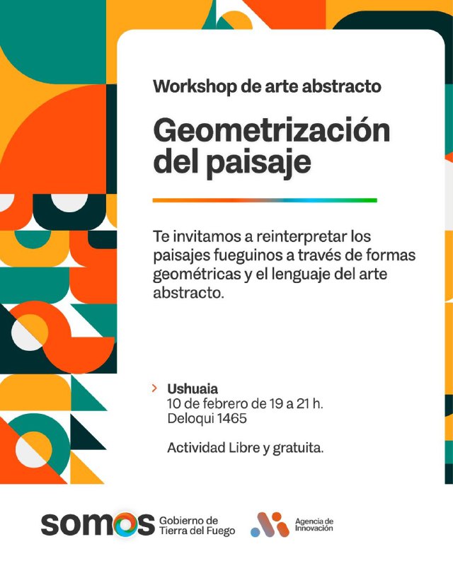 La Secretaría de Cultura invita a la comunidad a participar del Workshop de Geometrización del Paisaje – Arte abstracto a través de la geometría, que se llevará adelante el martes 10 de febrero, de 19 a 21 horas, en Deloqui 1465, en la ciudad de Ushuaia, en el marco de la muestra artística “Argentina Abstracta”.