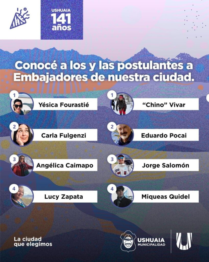 La comunidad de Ushuaia ya puede participar en la votación para seleccionar al Embajador y la Embajadora 2025, en el marco del 141° aniversario de la ciudad. La convocatoria, organizada por la Secretaría de Cultura y Educación de la Municipalidad, estará habilitada hasta el viernes 3 de octubre inclusive.